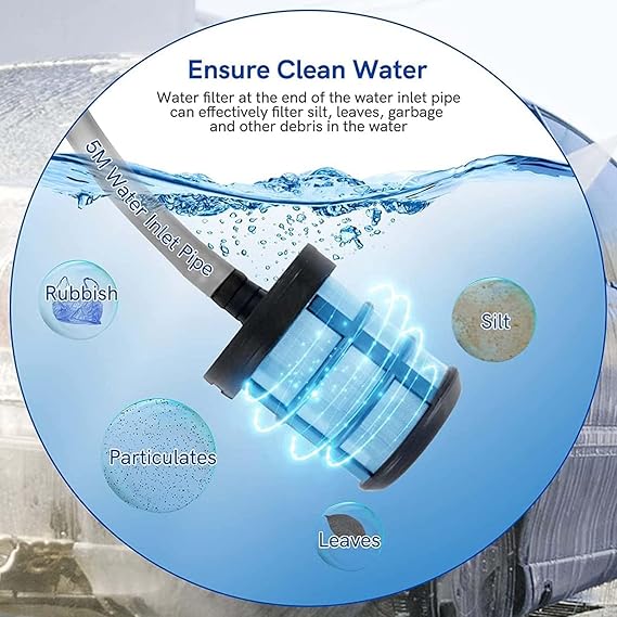 • DRAWS WATER FROM ANYWHERE – Come with a 5M long garden hose allow you to draw water from any fresh water source like a pool, lake, or bucket and . You can hook up to a garden hose at the house or even a 2L bottle on the go.